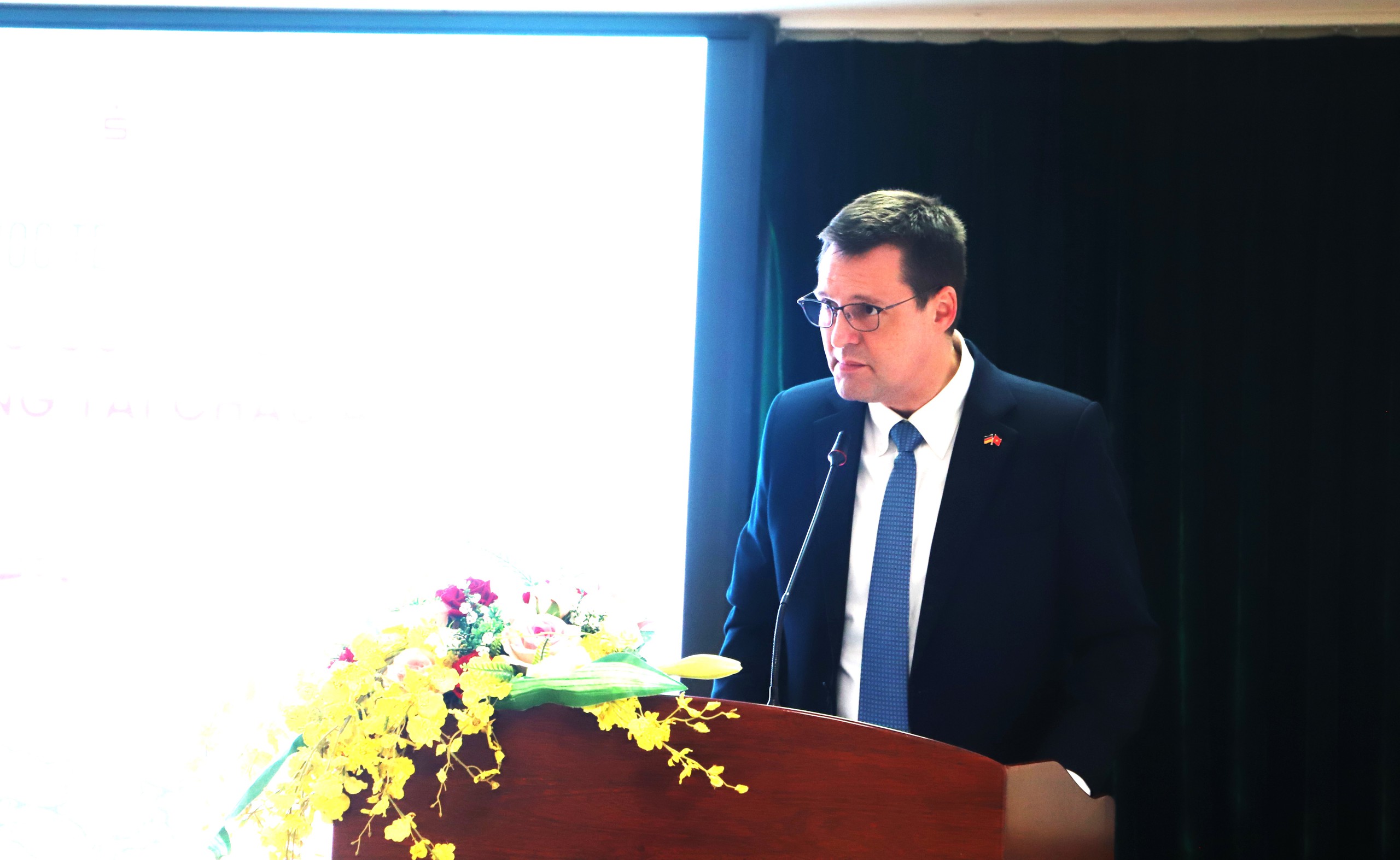 Ông Christian Grajek, Trưởng đại diện văn phòng Việt Nam, Trưởng điều phối khu vực Đông Nam Á, Quỹ hợp tác Quốc tế các Ngân hang tiết kiệm Đức, phát biểu tại Hội thảo